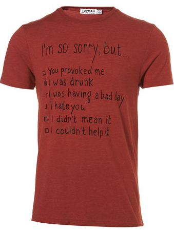 Slogan t-shirts never were the height of wit or sartorial style, but they have undoubtedly hit a new low with this ‘apology’ t-shirt from TopMan.