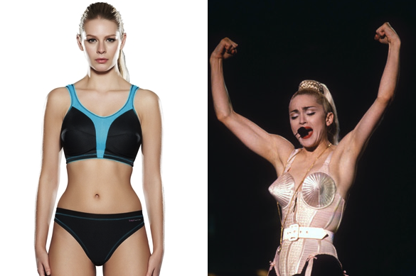 The downside? The shape is – certainly on me – bizarre. Putting it on prompted hysterical giggles in the changing room while the the end of my boobs failed to ease immediately in to the end of my bra: fembot nipples protruding visibly under my vest. And while this was soon rectified, my boobs looked less ‘popping to the gym’ and more ‘popping out people’s eyes left right and center’. Part Cone Bra, part Peggy-from-Mad-Men-in-a-sweater, I was as 50s sex vixen as it’s possible to be with Dri-Fit Lycra and a tangled ponytail. It might not be the look I’d default to in a fitness situation, but a look it is indeed…