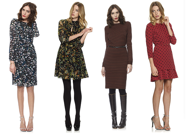 Above dresses left to right: Veronica Saffia print dress £165, Paisley print dress £150, Daryl column dress £75, Polly Polka spot dress £165