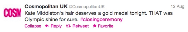 I don’t know whether it’s a getting older thing or if it’s just getting worse, but Cosmopolitan seems to truly be scraping the barrel for their online readers these days. Not only did I unfollow them on my non-boob account for missing the point of the Olympics entirely with this tweet at the closing ceremony: